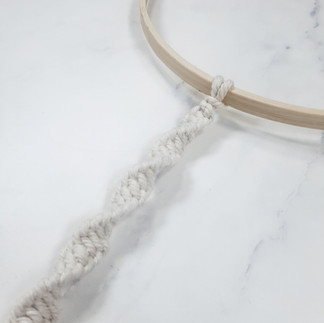 Schneide vom beigen Makrameegarn 3 Schnüre mit einer Länge von je 90cm zu und fixiere diese mit dem Ankerknoten am Holzreifen. Nun hast du 6 gleich lange Schnüre an deinem Holzreifen.