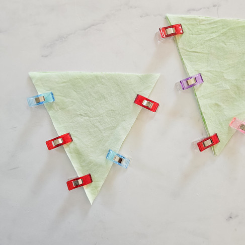 Schneide nun alle vorgezeichneten Teile (gerade Anzahl) aus (Bild 1). Leg immer zwei Teile mit der bemusterten Seite zueinander aufeinander und stecke die Wimpelspitze rechts und links mit Nähklammern ab (Bild 2).