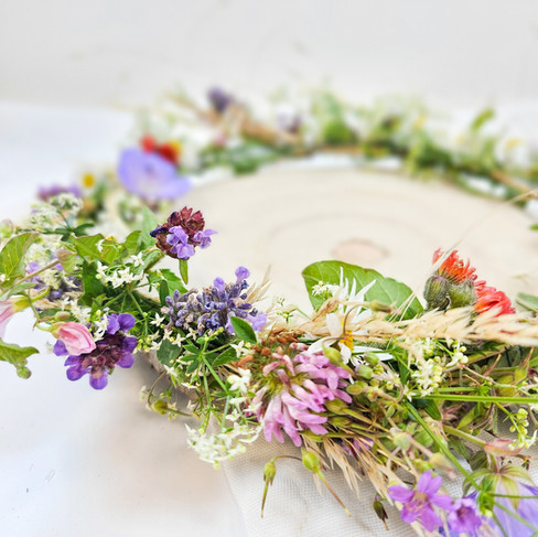 Pflücke deine Blumen und Gräser (ich habe hier einen natürlichen Feld- und Wiesenmix verwendet) und falls dein Kranz Kontakt mit Lebensmittel haben sollte - wie z.B. als Deko für eine sommerliche Torte, dann achte unbedingt darauf nur Pflanzen zu benutzen die essbar sind (eine Pflanzenapp kann hier weiterhelfen ;-)) und wenig Pollen haben, also zum Beispiel mit Gräsern sparsam sein.