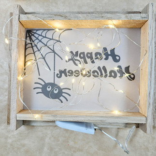 Nun brauchst du dein leuchtendes Halloween-Bild nur noch anschalten und in deine Deko integrieren. Du kannst es auf den Tisch stellen oder auch als Bild an die Wand hängen...die Möglichkeiten sind endlos... Die kleinen goldenen Spinnen z.B. sind ein cooler DIY-Hack mit der Heißklebepistole