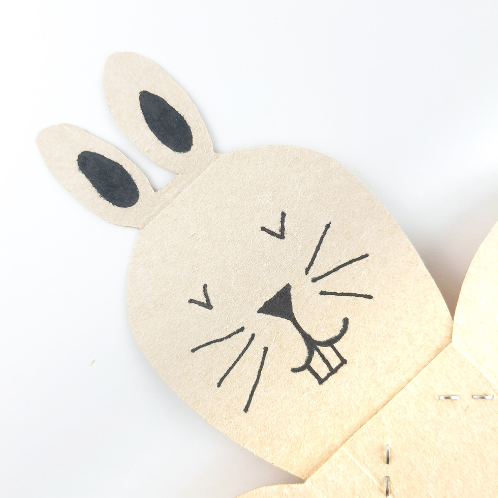 Zeichne deinem Hasen ein Gesicht. Nutze dazu einen schwarze Stift der nicht zum "verlaufen" neigt. Am Besten an einem Reststück vorher austesten.