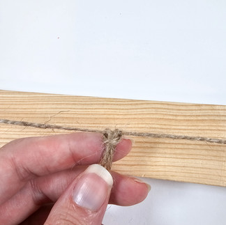 TIPP Wenn du den Faden gespannt fixierst (ich habe hier eine Holzlatte mit zwei Nägeln darin verwendet) kannst du leichter die Fäden anknoten.