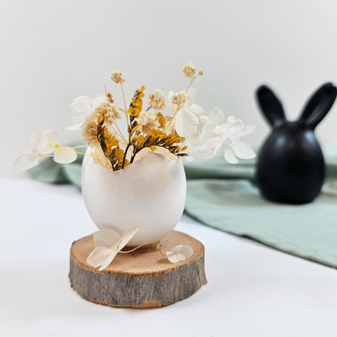 Jetzt musst du das Ei nur noch befüllen. Entweder mit Trockenblumen oder mit etwas Wasser und frisch gepflückten kleinen Frühlingsblumen - perfekt für das Mini-Sträußchen vom Spaziergang.