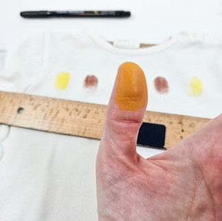 Verwende nun beim Stempeln immer den gleichen Finger (außer die Abdrücke sollen unterschiedlich ausfallen) und eine Farbe nach der anderen, so musst du nur zwischen den Farbwechseln den Finger gründlich reinigen. Du kannst mit Textilstempelkissen arbeiten oder deinen Finger mit Textilstiften rund bemalen - funktioniert beides und ja auch die Stifte lösen sich wieder gut vom Finger ab.