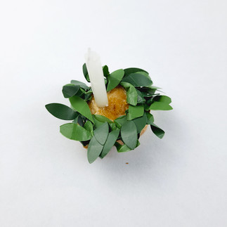 Schneide etwas Tannengrün oder künstliches Grün ab und formt es zu einem Kreis. Klebe diesen mit Flüssigkleber auf der kleinen Holzscheibe auf. Diese habe ich von einem kleinen Ast abgesägt (ca. 2,5 cm Durchmesser). Trocknen lassen.