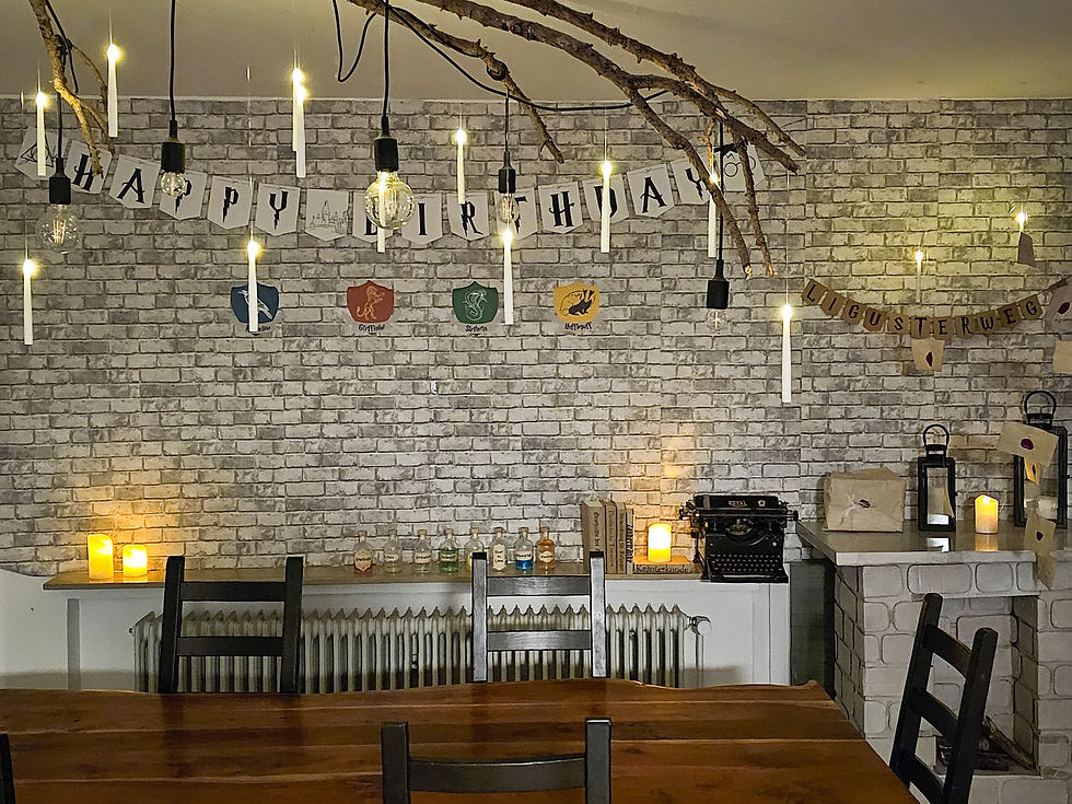 An die Wand über den Kamin (diese habe ich provisorisch mit einer Backsteintapete* beklebt, hier ist der Übergang zum Großen Saal in Hogwarts) kam zum Abschluss noch die Wimpelkette "Ligusterweg 4".