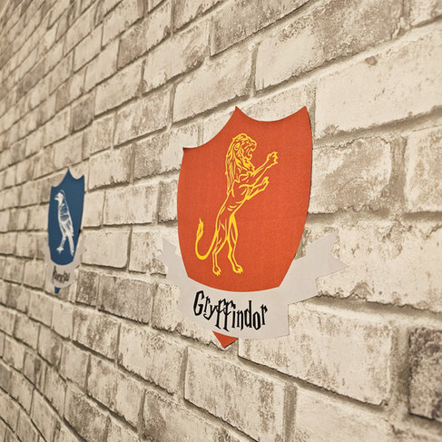 Doch der große Saal wurde natürlich noch passend dekoriert: Die große Fensterfront hinter dem Esstisch habe ich mit vielen Bahnen der Ziegelsteintapete* beklebt (so das man sie danach leicht wieder von den Wänden ablösen kann) und darauf die vier Wappen von Hogwarts aufgeklebt. Dazu habe ich meine Vorlage einfach auf A4-Etikettenpapier* gedruckt und ausgeschnitten. Alternativ kannst du auch fertige Wappen kaufen:
